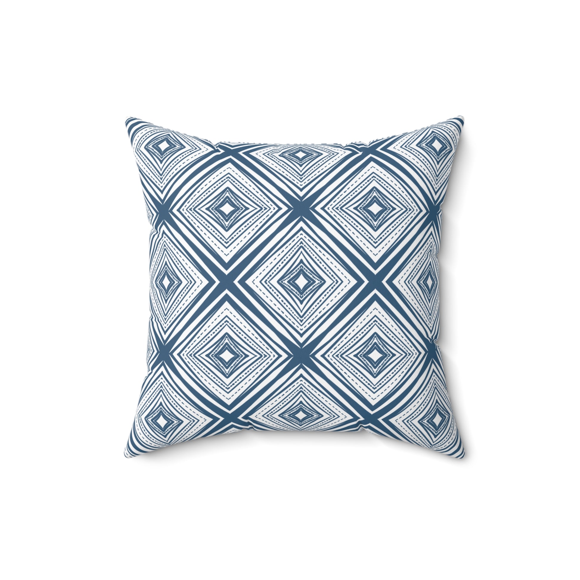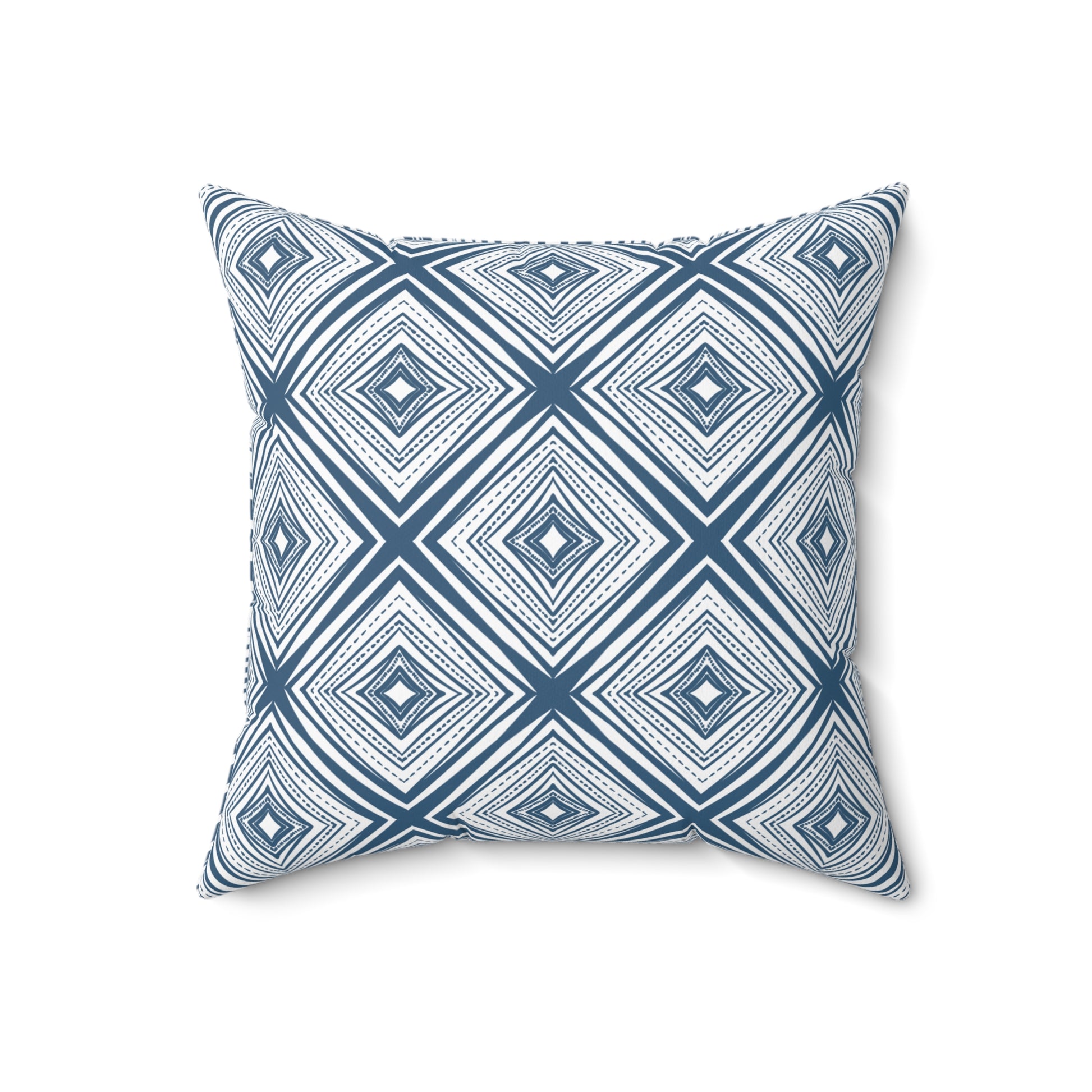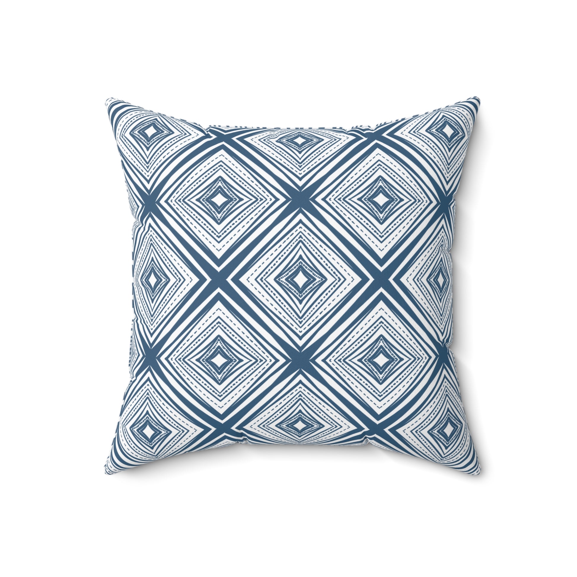 This square throw pillow brings calm geometry to living rooms and bedrooms. A layered diamond pattern in denim-blue tones creates subtle movement without shouting — it reads modern but warm, like woven textiles softened by time. The double-sided print keeps the design consistent from every angle. Stuff the included recycled polyester insert into the cover and watch the pillow bloom into a plump accent that anchors sofas, window seats, and reading nooks. It’s the kind of piece that quietly ties together neutral palettes, coastal schemes, and contemporary minimalism, adding texture and a handcrafted feel to quiet moments at home or cozy gatherings.