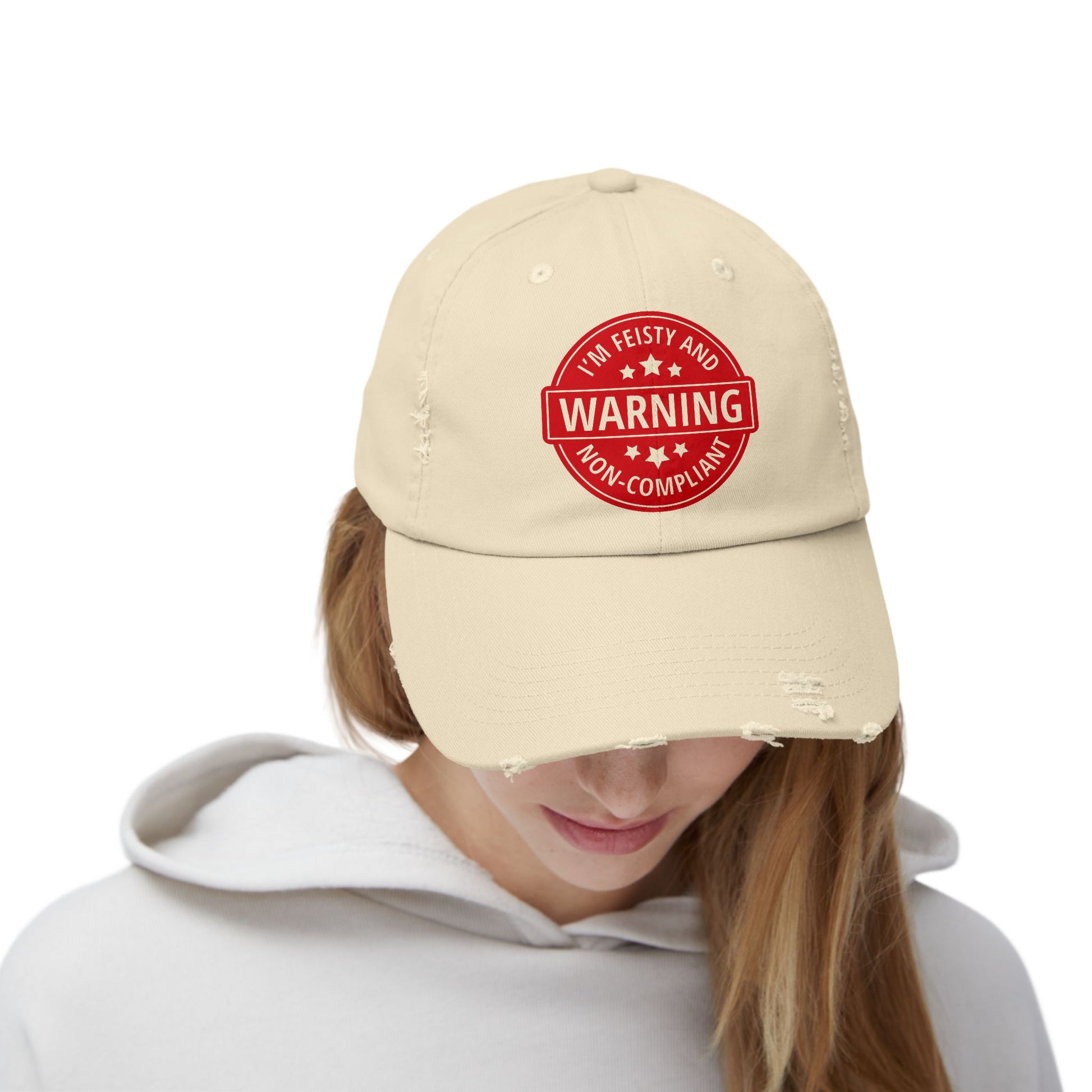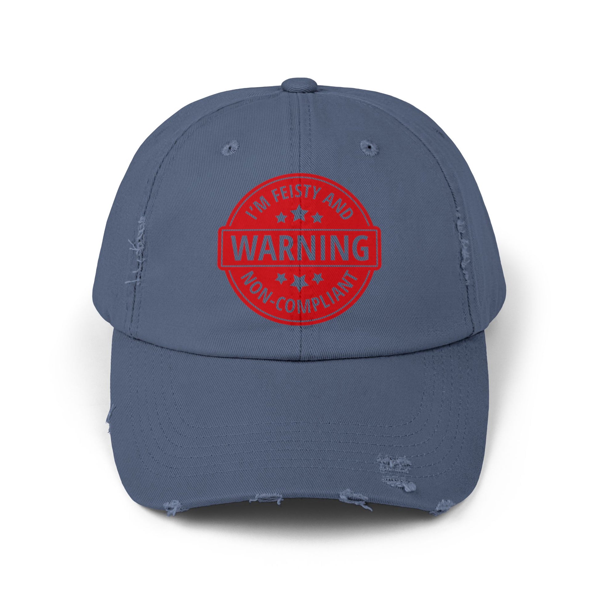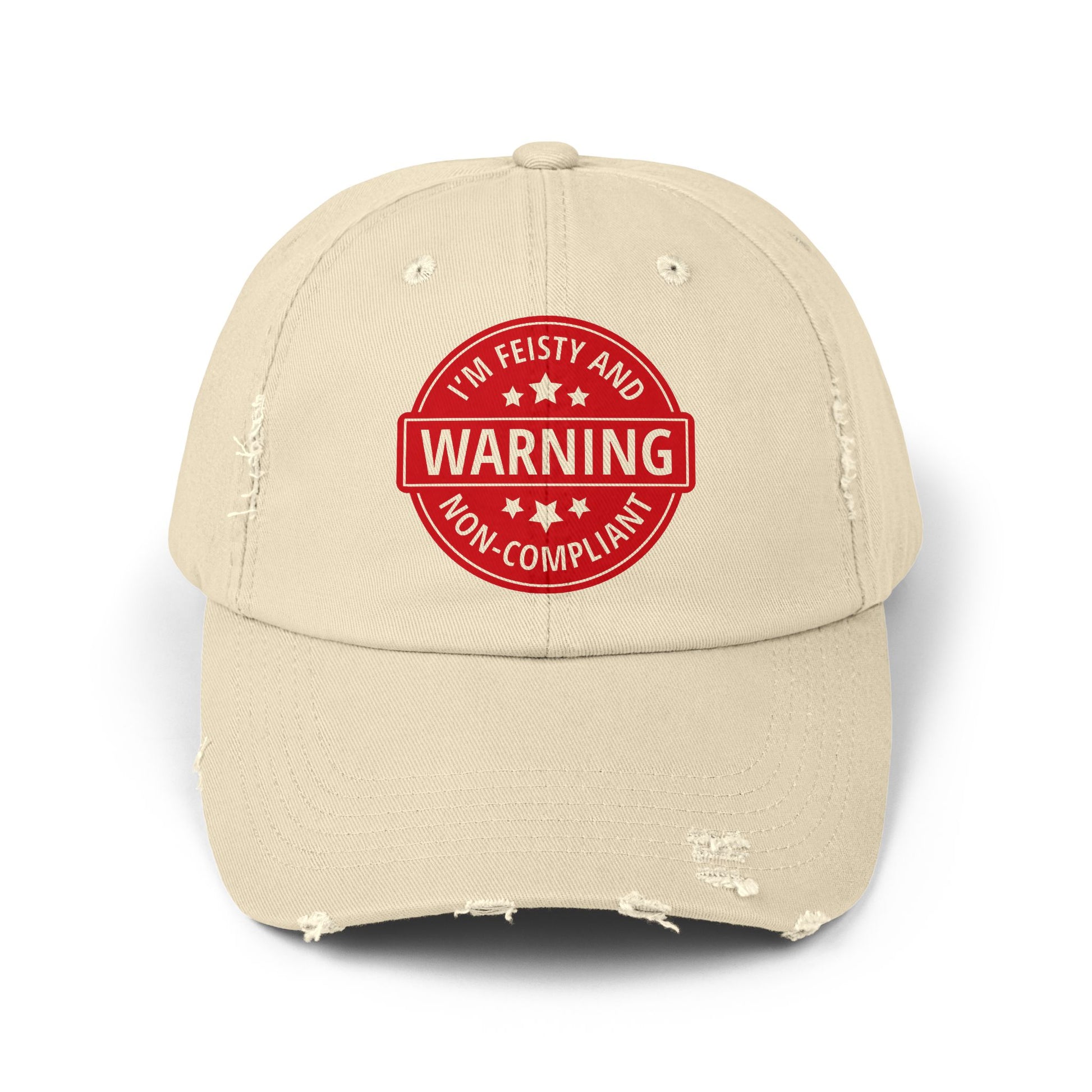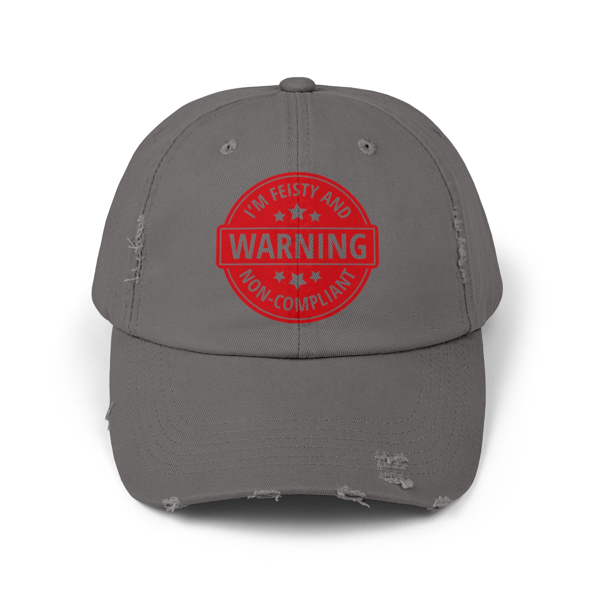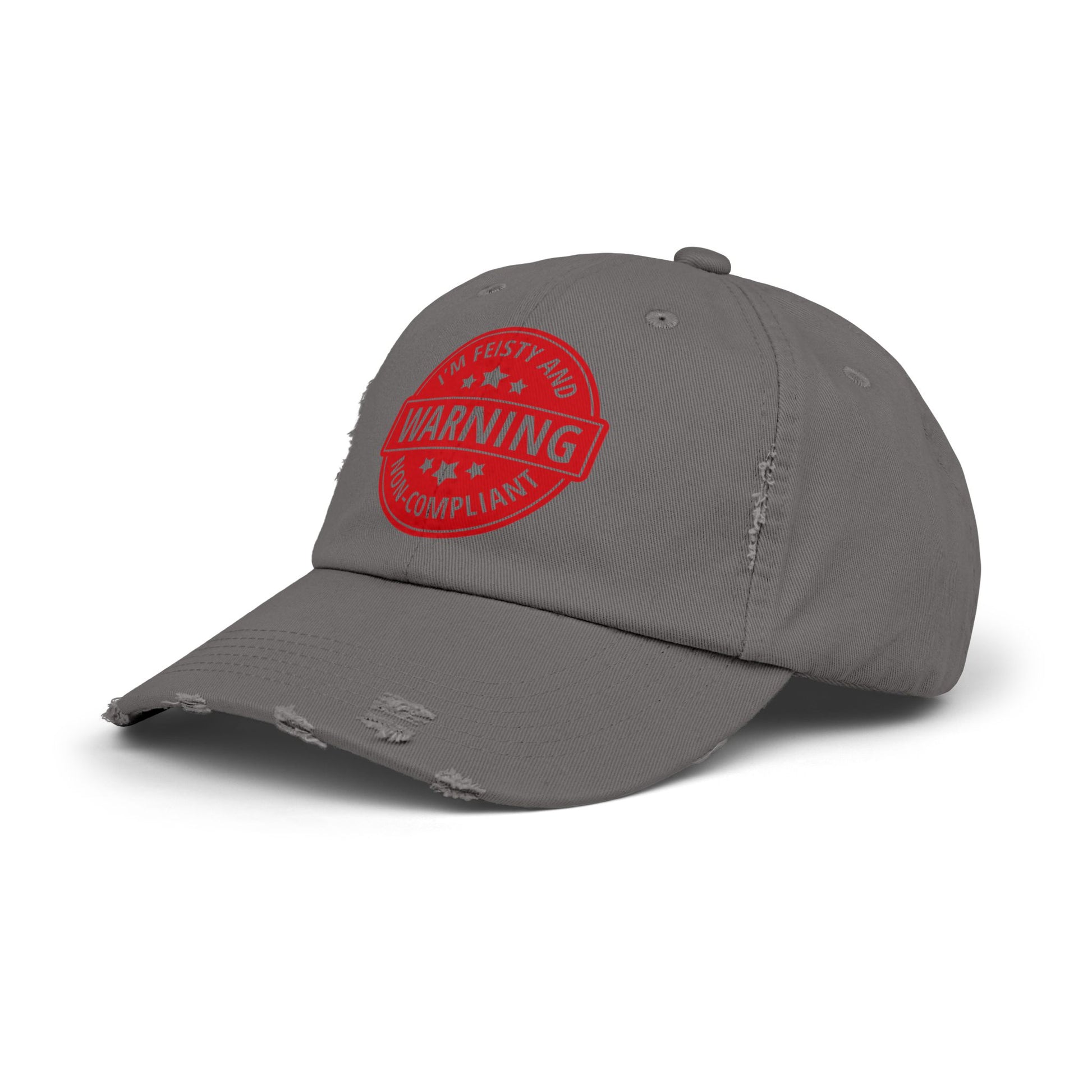 Distressed Cap — "Warning: I'm Feisty and Non-Compliant" Red Badge Hat