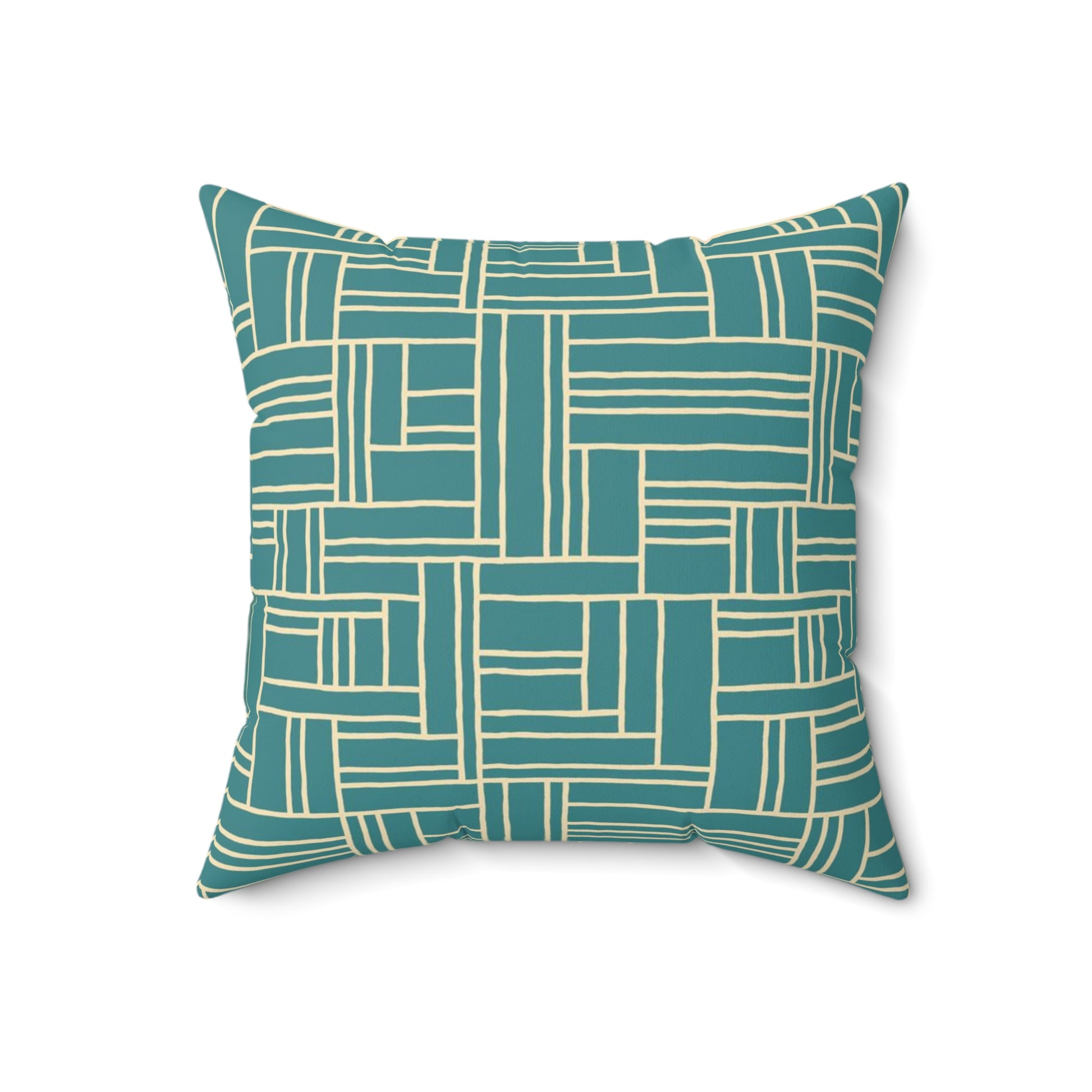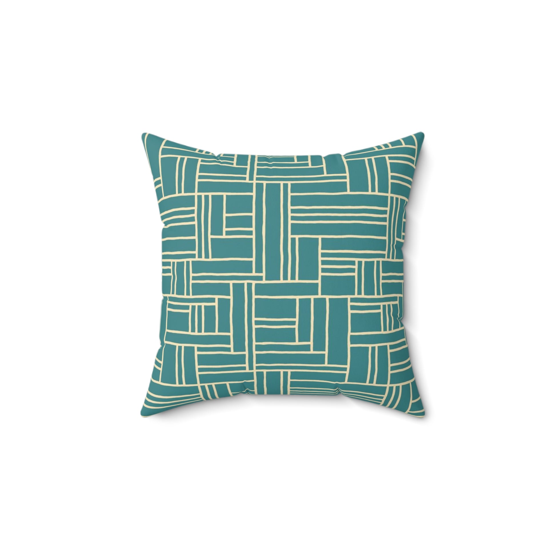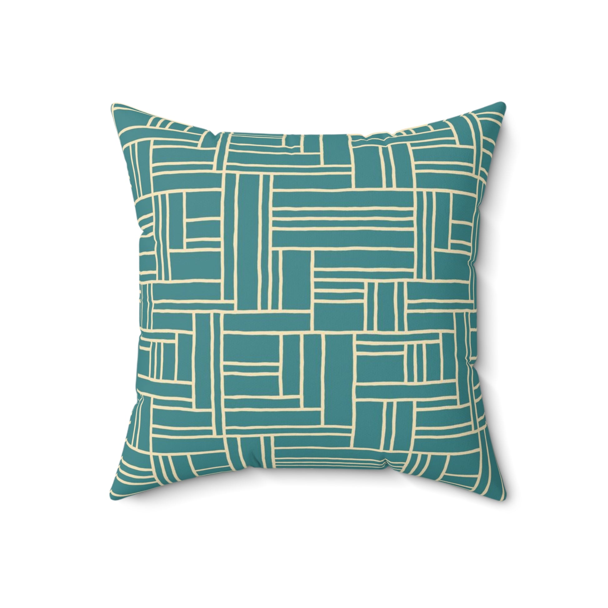 A woven-inspired square pillow in soothing teal and soft cream. The geometric, hand-drawn grid pattern brings quiet structure to a relaxed space — like a tidy stack of books or a woven basket on a sunlit porch. The colors read calm and coastal, making the pillow a gentle anchor on a sofa, reading chair, or layered on a bed. The cover’s double-sided print keeps the look consistent from every angle, while the slightly oversized recycled polyester insert fills the shape into a plump, welcoming cushion. Because the cover ships separately from the insert, it arrives smooth and ready to assemble without bulky creasing. This pillow suits someone who appreciates clean lines, tactile patterning, and a quietly curated home aesthetic.